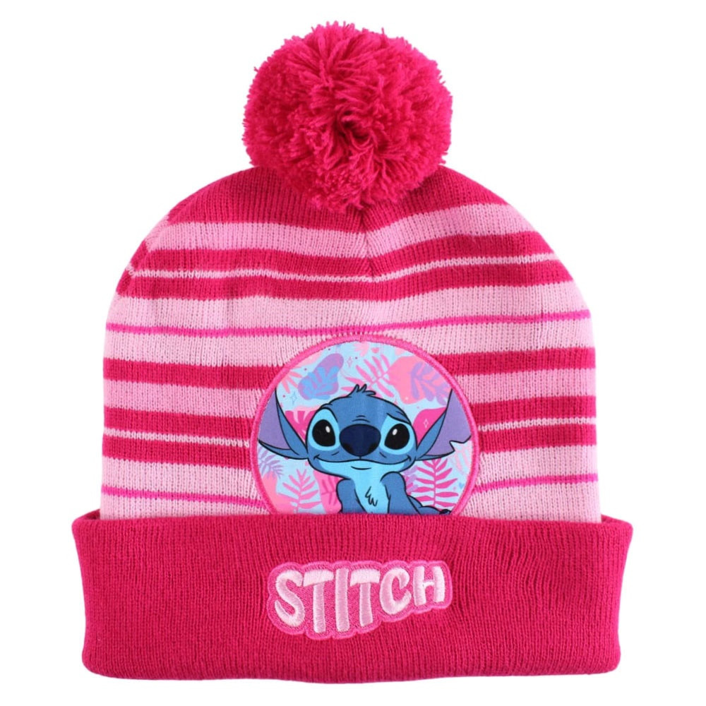 Aranyos, meleg kötött sapka a népszerű Stitch figurával díszítve. Puha és kényelmes viselet a hűvösebb napokra, a felső részén található bojt pedig játékos megjelenést biztosít.